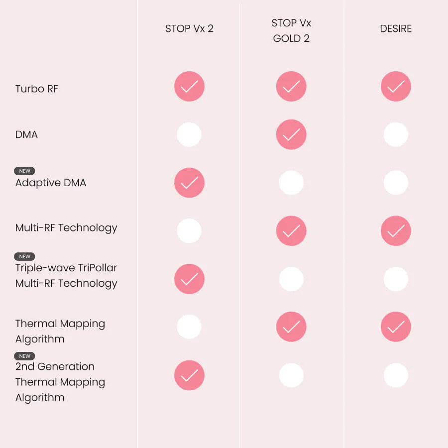 Additionally, the STOP Vx 2 features the latest innovation from TriPollar, the 3rd generation Adaptive DMA. This brand-new feature automatically adjusts the DMA action in real time to ensure a pleasant treatment and a superior result.