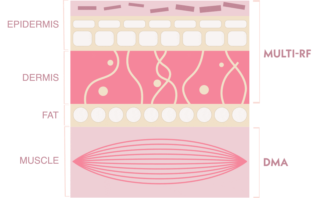 TriPollar’s Radio Frequency technology is the key to achieving youthful-looking results without the use of invasive treatments, clinically proven to heat the dermis layer of the skin while improving it superficially. Multi-RF, however, presents the next generation of this technology, speeding up the process in which the dermis layer of the skin is warmed to the optimal temperature for boosted collagen production by harnessing interchanging radio frequency waves that effectively smooth the skin and reduce the appearance of lines and wrinkles. Combined with jawline-toning DMA, it contributes to a lifted, more contoured-looking face.